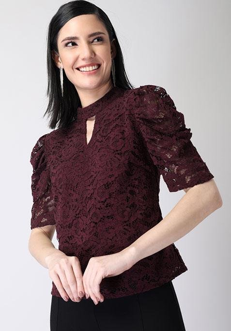 Wine Cut Out Neck Lace Top | chic lilac top