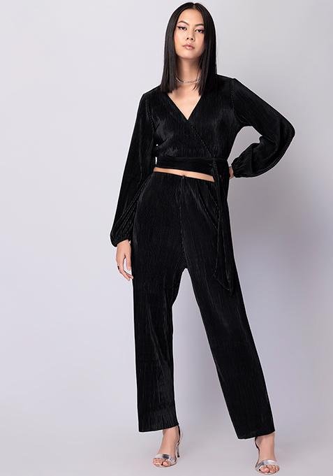 Black Peplum Wrap Top And Trousers Co-ord Set